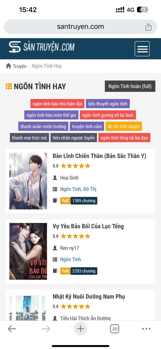 Tìm đọc những bộ truyện ngôn tình hay nhất, list ngôn tình được sàn truyện tuyển chọn rất kỹ, sàn lọc từ những đánh giá, phản hồi tích cực của độc giả, lượt truy cập truyện hàng ngày.