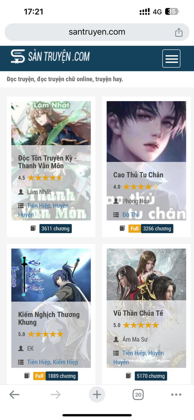 Sàn Truyện - Kho truyện số 1 hiện nay. Hàng ngàn truyện hay, truyện full được biên soạn kỹ càng, chọn lọc rất kỹ. Truy cập website Santruyen.com để tìm đọc những bộ truyện với nhiều thể loại khác nhau ngay nhé!